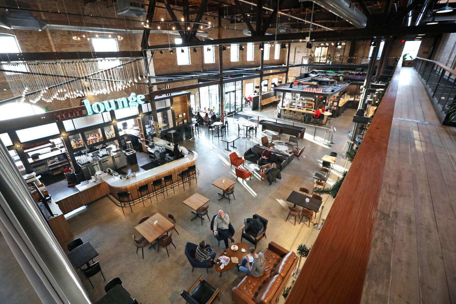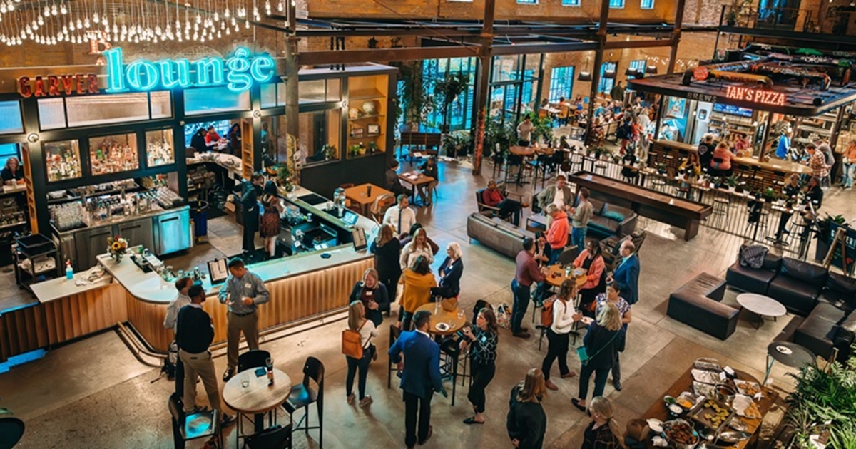 Garver Lounge is a modern space at the heart of the building, featuring an elevated drink menu and seasonal cuisine in a setting that blends historic character with contemporary style.